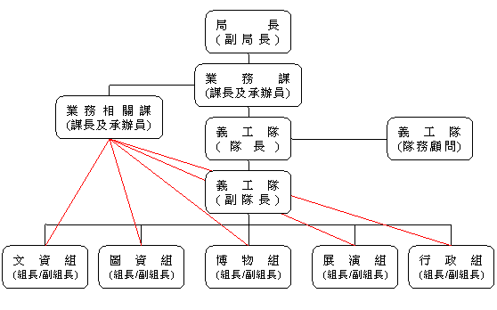 第九條 本隊為隊務推動需要,特編定行政、圖資、展演、博物及文資等5組,各組業務職掌如下: